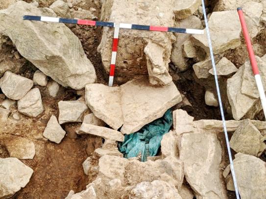 Last month I reported on the sections cut at right-angles across the central sandy clay mound. We've now cut another section on the southeast side of our second urn which is starting to show that the mound was constructed in at least two different ways. In this area the mound seems to be mainly built of loose stone like a cairn, whereas the rest is fairly clean sandy clay. In other places however, the sandy clay is edged by loose stones. Our section at right-angles to this, going through our second urn, is also producing exciting results, particularly on the northwest side. Here a collection of large flat stones seem to be arranged in the form of a small cist lying under the sandy clay mound. Nothing can be seen as yet inside but fragments of bone are turning up in the immediate vicinity (we've installed covers for the moment to protect the internals).