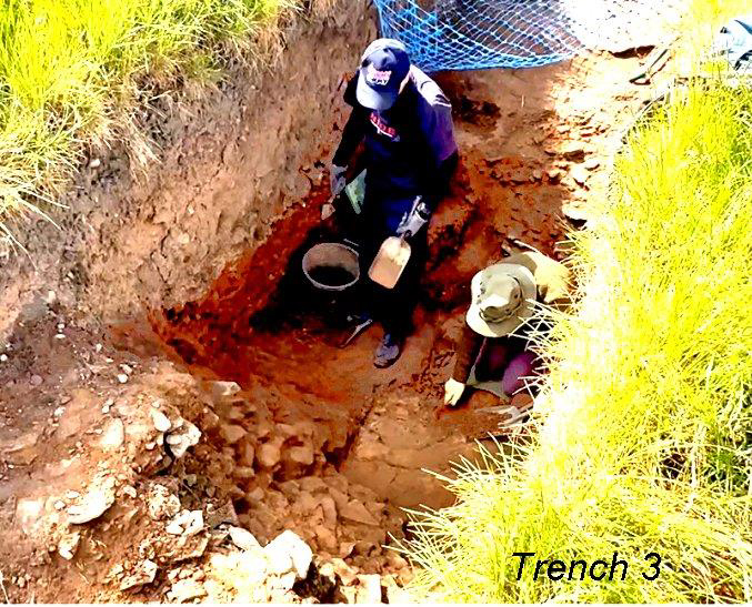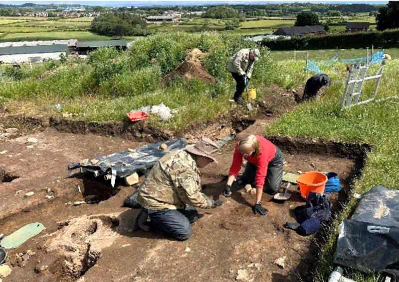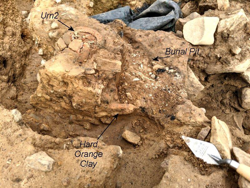 It was particularly dry last month, which was great for our volunteers, but it dried out the ground making it more difficult to excavate. Despite this we have made great progress uncovering more and more of the mottled clay layer. This has revealed some interesting patches containing charcoal and some cremated bone but, as yet no more burials. We've also been able to clear all of our ditches ready for potential visitors. As reported in last month's Newsletter, we have been talking with osteologists about what to do with our large collection of cremated bone i.e. how to have it processed and analysed. We were very pleased therefore to welcome Dr Sam Walsh on site last month to inspect our finds and give her advice on them. Like everyone who visits our site, she was amazed at the size of the monument and quality of our excavations. Sam is a lecturer at UCLan and has a lot of experience working with cremated bone. She has worked on the remains from various sites including the Morecombe Bay Bronze Age Barrow excavated by Dig Ventures. She was able to give helpful advice on the excavation of the bone still in situ and how to prepare it for analysis. She also said that, if we wanted, she would be available towards the end of the year to carry out its analysis. We've also made good progress preparing the two urns ready for lifting later this month. We are however having some difficulty with our second urn as it appears to have a cremation burial lying in a pit underneath it. The urn itself is in poor condition with pieces already falling off it. It is unlikely therefore that we will be able to extract it intact. The loose pieces though have enabled us to peer inside, and this has revealed it to be mostly empty. We will however attempt to block-lift it together with any contents lying below it.