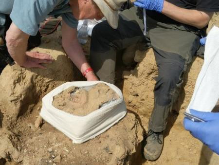Last month we completed the task of block-lifting our second urn and having it transported to the Museum's Archive facility in Bolton. For various reasons the exercise turned out to be more difficult than expected. The idea was that, once the block had been wrapped and encased in Plaster of Paris, we could crack it free from the underlying sandy clay. It could then be lifted on a steel supporting plate. All went well with the wrapping, first with cling film, then bandages, followed by a soft interface and then Plaster of Paris bandages. Once set, the block was gently undercut all around, ready for the next step which was to crack it away from the underlying clay.