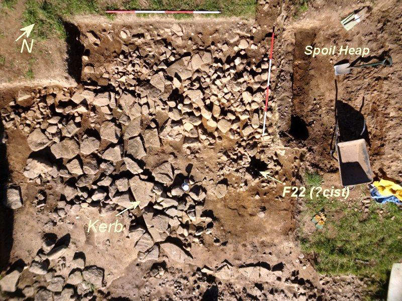 The discovery last month of a curved alignment of stones has been quite exciting, but has meant we have had to open up the whole of the area on the northwest side of Trench 1b. This has consumed earlier Trenches 1c and 1d but has shown the curved alignment continuing. We now believe this to be the remains of an earlier kerbed cairn. Encompassing the northern sector are cobble stones rather than the usual small flat rectangular ones we generally find in this central area. At the focal point of the curved alignment is a deep collection of stones which could well be another cist burial (F22) although, as yet, there has been no signs of a burial inside.
