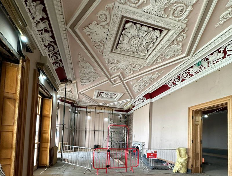 The major focus of work so far has been on the exterior, particularly the roof which has had to be completely replaced. In each room, plans for its future use were explained, including widening some doors and a lift being installed to provide access for all visitors. A café is planned for the ground floor, overlooking the golf course, and a roof top terrace on that same side. The ground floor will still be available for weddings and other functions but the first floor is to be transformed to cater for temporary art exhibitions of national importance. On the upper floors, bedrooms will be available for wedding guests to stay overnight, but it will not generally operate as a hotel.
