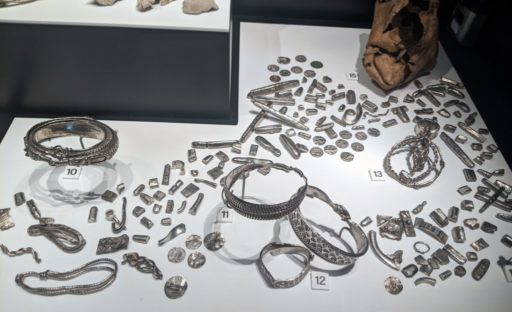 One of the dominant features of the exhibition was the hoards from the Roman and Viking periods. The most fascinating for me was the Malpas hoard, which was found by detectorists in 2014. Significantly it consists of coins from before the Roman invasion, i.e. 28 silver denarii (Emperor Tiberius) and 7 gold British coins from the Dobunni and Corieltauvi tribes.