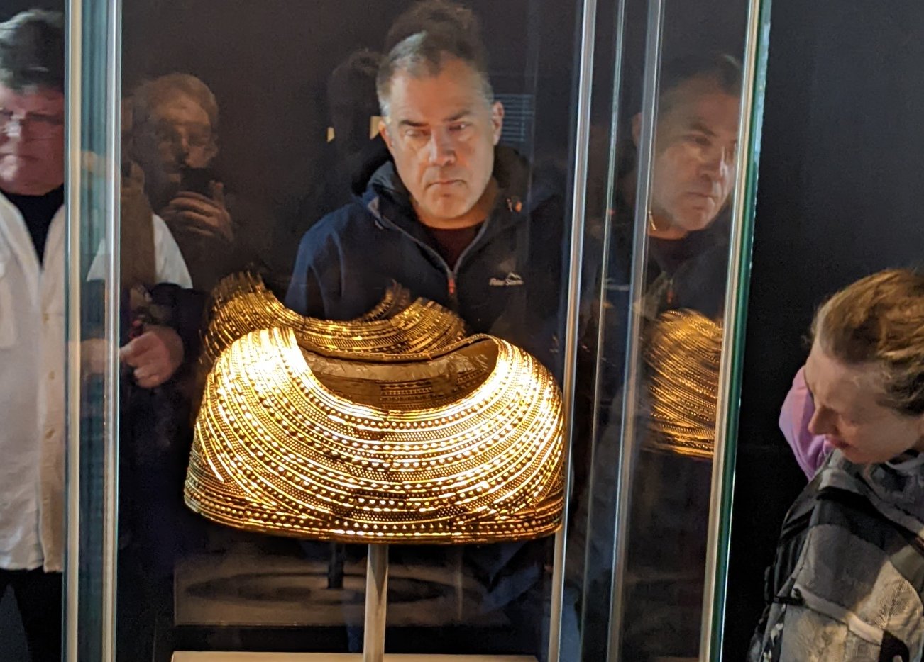 The highlight for me though was the fabulous gold Cape found by workmen in 1833 while quarrying stone near Mold in North Wales. This stunning ceremonial gold artefact also from the Bronze Age was discovered lying crushed in the stone cist of a burial mound, beside the fragmentary remains of a body. At the time its pieces were dispersed and it wasn’t clear what the pieces represented. Only when they were all brought together and the restoration completed that the true form of the artefact could be realised.