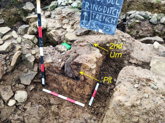 Further work on the area around the second urn (discovered last year buried upside down), has revealed it to be lying in a pit cut into the sandy clay mound (not, as we previously thought, buried with it). The pit has a flat bottom and seems to be full of charcoal and cremated bone.